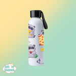 The water bottle is made of recycled aluminium with a white coating on the outside. Aluminium is a lot better for you and the environment than plastic water bottles. The cap is made of recycled plastic with a rubber band. The design on the water bottle is made with UV printing technology, which makes it water and UV proof.