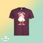 Unisex soft midnight blue or bordeaux red t-shirt with a full colour don’t duck with me design